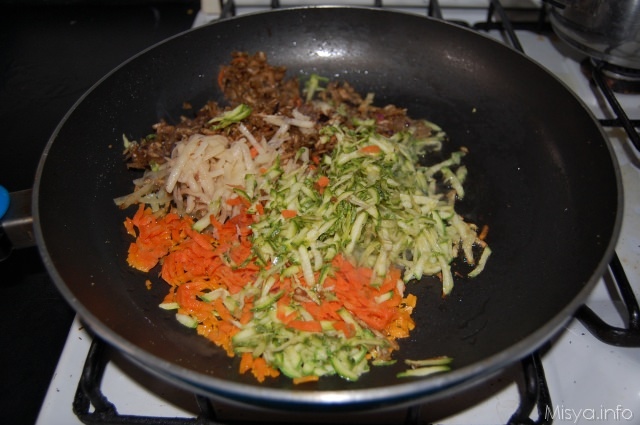 Mondare la zucchina e la melanzana, pelare la patata e le carota. Grattugiate le verdure in una grattugia dai fori larghi e raccoglietele in un'ampia ciotola