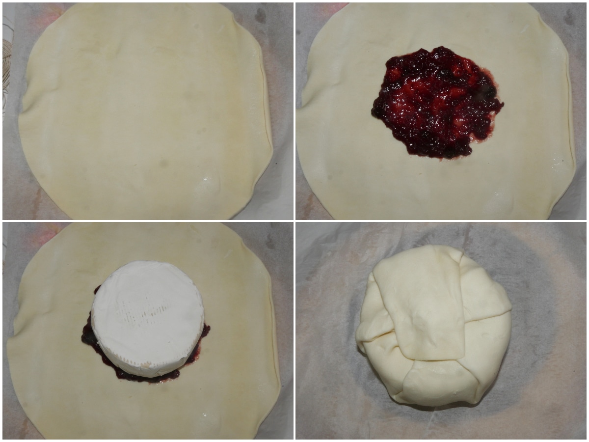 Srotolate delicatamente la pasta sfoglia sulla sua carta forno, distribuite al centro un po' di marmellata (quella di mirtilli rossi è perfetta, secondo me), poggiateci sopra il formaggio e richiudete la sfoglia sul ripieno.