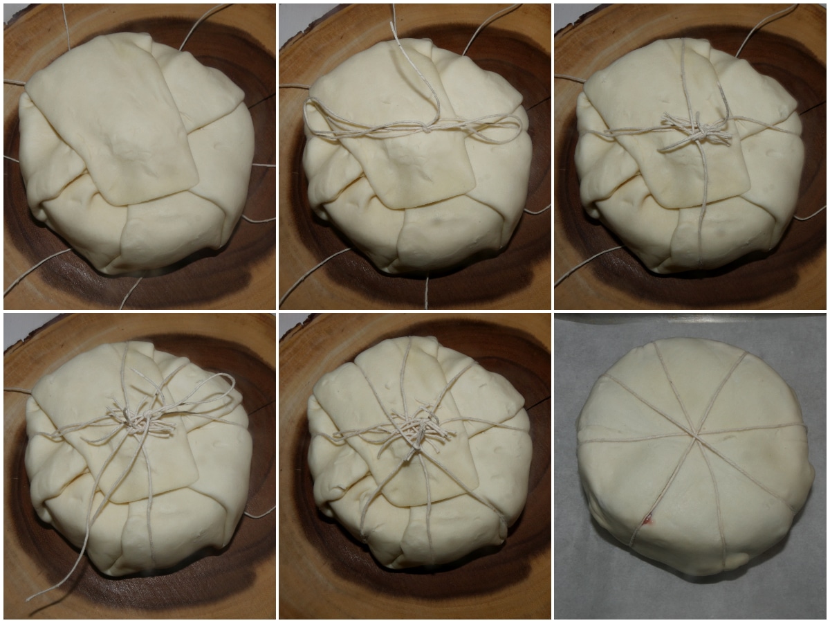 Avvolgete dello spago da cucina sulla forma, senza stringere troppo, creando 8 spicchi, quindi capovolgete la forma, in modo da avere il lato liscio e senza nodi dello spago verso l'alto.