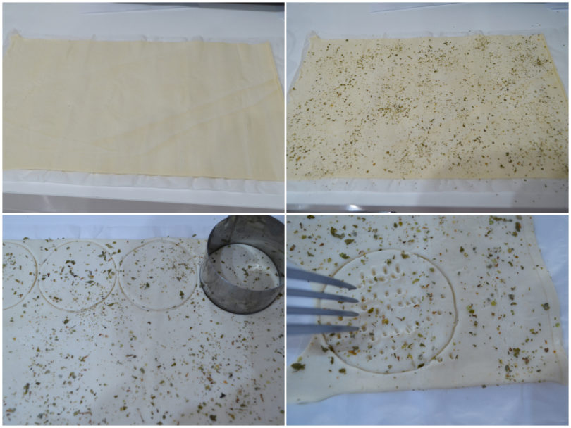 Stendete la pasta brisée, disseminatela di un trito di erbe aromatiche a piacere, quindi con un coppapasta da 7 cm ricavate le basi per i vostri canapè e bucherellateli.