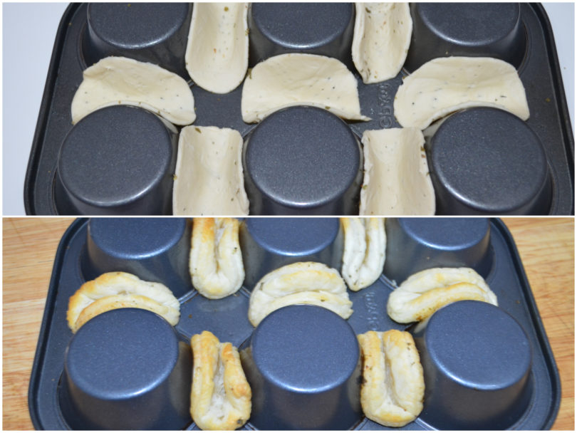 Usando una teglia per muffin capovolta (e legegrmente unta) come stampo, conferite alle vostre formine la forma di piccolissimi tacos, facendo attenzione a lasciare all'esterno la parte con le erbette.