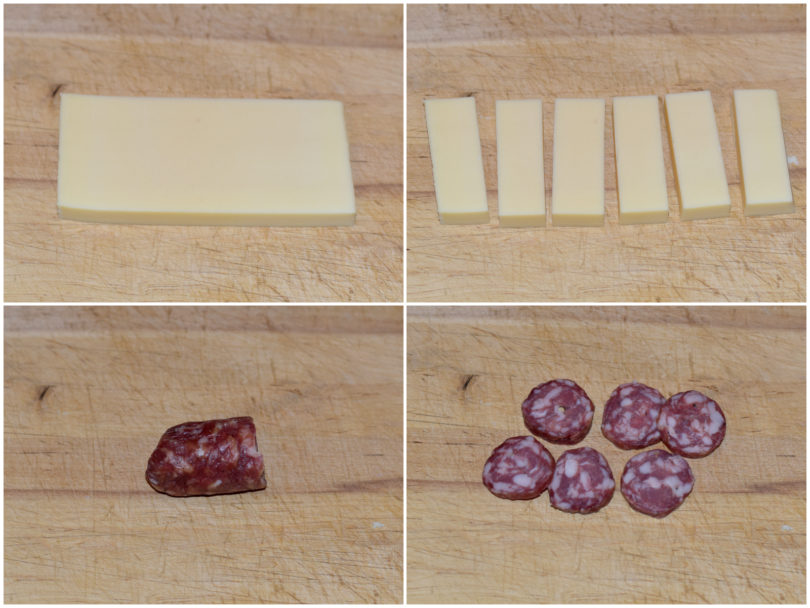 Mentre il pane si raffredda, spellate e tagliate il salame a fettine, quidni tagliate il formaggio a bastoncini di circa 2 cm per lato (o comunque più piccoli del diametro del salame).