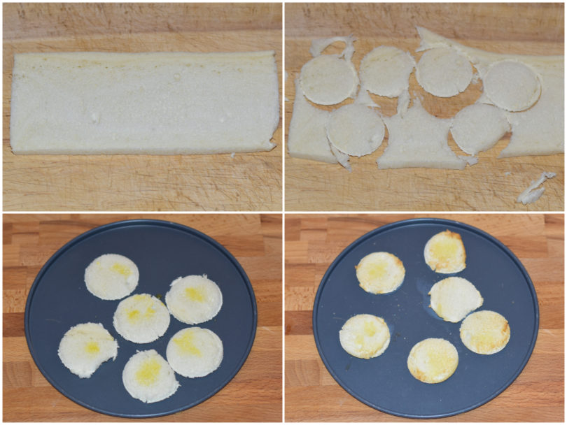 Innanzitutto ritagliate dei cerchietti dal pane per tramezzini, di circa 3-4 cm: dovranno essere uguali, o leggermente più grandi, del diametro del salame.