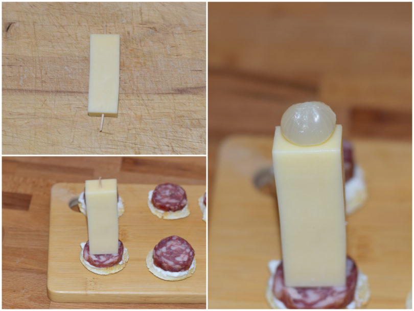 Tagliate 6 stuzzicadenti a metà e infilzatene ognuna da un lato di un bastoncino di formaggio: usatene uno per infilzare il formaggio sulla base, quindi sfruttate l'altro per aggiungere una cipollina (fungerà da fiammella).