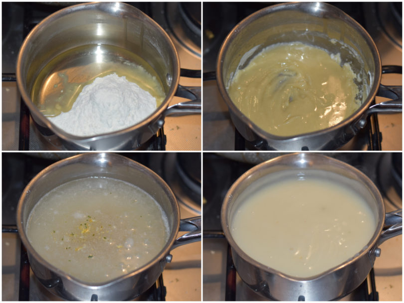 Nel frattempo che la salsa cuoce preparate la besciamella: mescolate olio e farina in una pentola a fiamma bassa, poi incorporate il brodo caldo e continuate la cottura mescolando costantemente fino a farla addensare.
