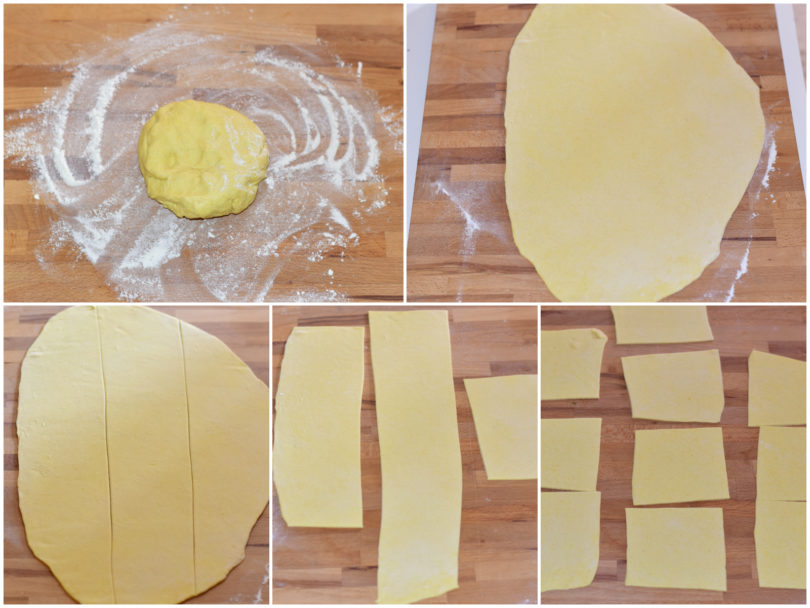 Riprendete la pasta, stendetela con il matterello in una sfoglia abbastanza sottile sul piano di lavoro leggermente infarinato e tagliatela prima in strisce larghe circa 8 cm e poi in rettangoli.