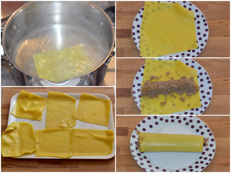 Sbollentate la pasta in acqua bollente leggermente salata e scolatela al dente, quindi farcite ogni rettangolo al centro con il ripieno e chiudeteci intorno i due lembi di pasta laterali per formare i cannelloni.