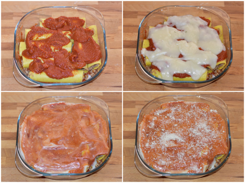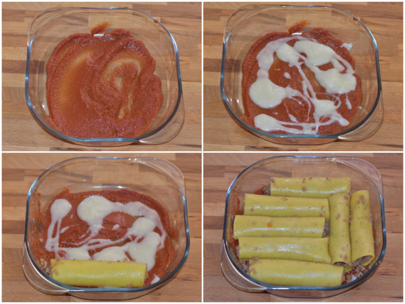 Assemblate: versate poca salsa sul fondo di una pirofila, aggiungete poca besciamella e poi i cannelloni.
