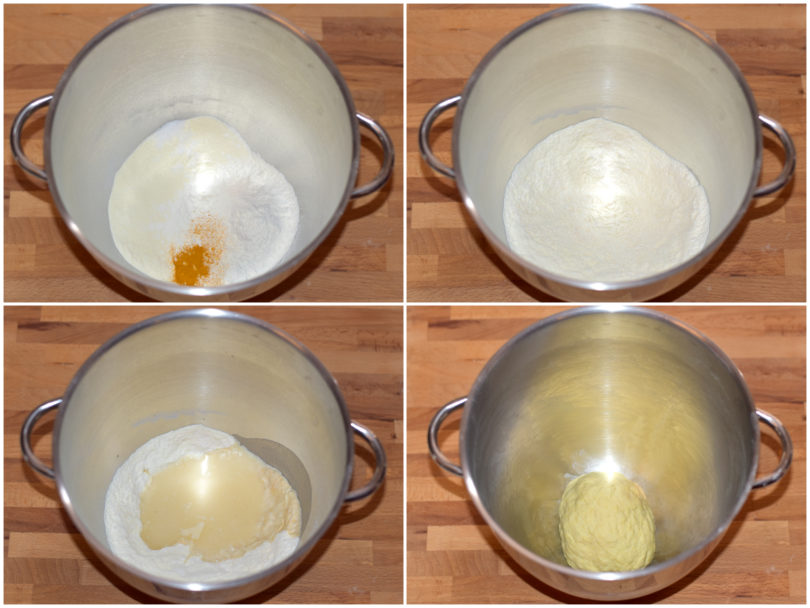 Preparate la pasta: unite le farine, la curcuma (serve per il colore, non darà sapore) e il sale in una ciotola e amalgamate, quindi incorporate l'acqua e lavorate velocemente fino ad ottenere un panetto omogeneo, quindi coprite con pellicola e lasciate riposare.
