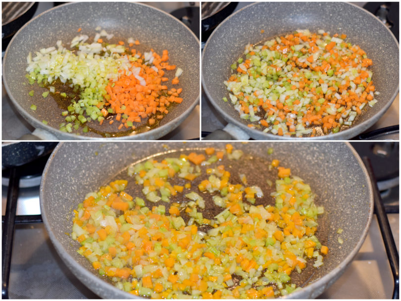 Nel frattempo preparate il ragù bianco per il ripieno: mondate e tritate cipolla, sedano e carota, poi lasciatele appassire in un'ampia padella antiaderente con un po' di olio.