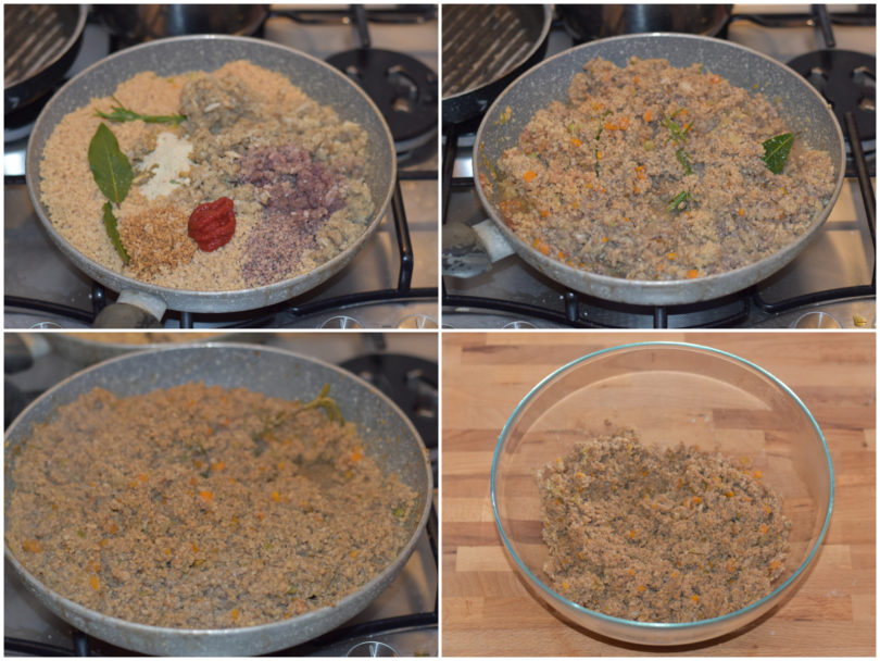 Incorporate sia il granulare che i funghi nella padella, unite anche concentrato di pomodoro e aromi (noce moscata, pepe, odori), sfumate con vino e salsa di soia e lasciate insaporire per almeno 30 minuti o fin quando non sarà diventato abbastanza compatto (se ci mette troppo tempo potete aiutarvi a fine cottura con 1-2 cucchiai di pangrattato, senza esagerare).