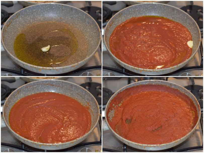 Preparate un sugo di pomodoro semplice con aglio, olio, passata e sale e lasciatelo cuocere per almeno 10-15 minuti a fiamma medio-bassa.