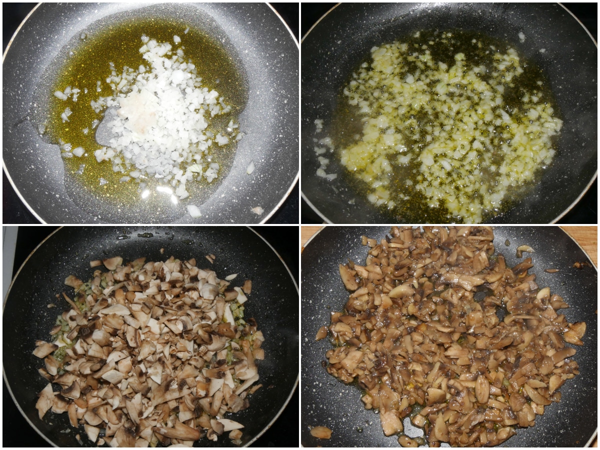 Intanto fate appassire la cipolla tritata in una padella ampia con olio abbondante, quindi aggiungete i funghi, insaporite con sale e pepe, mescolate e lasciate cuocere per 5-6 minuti a fiamma bassa con coperchio.