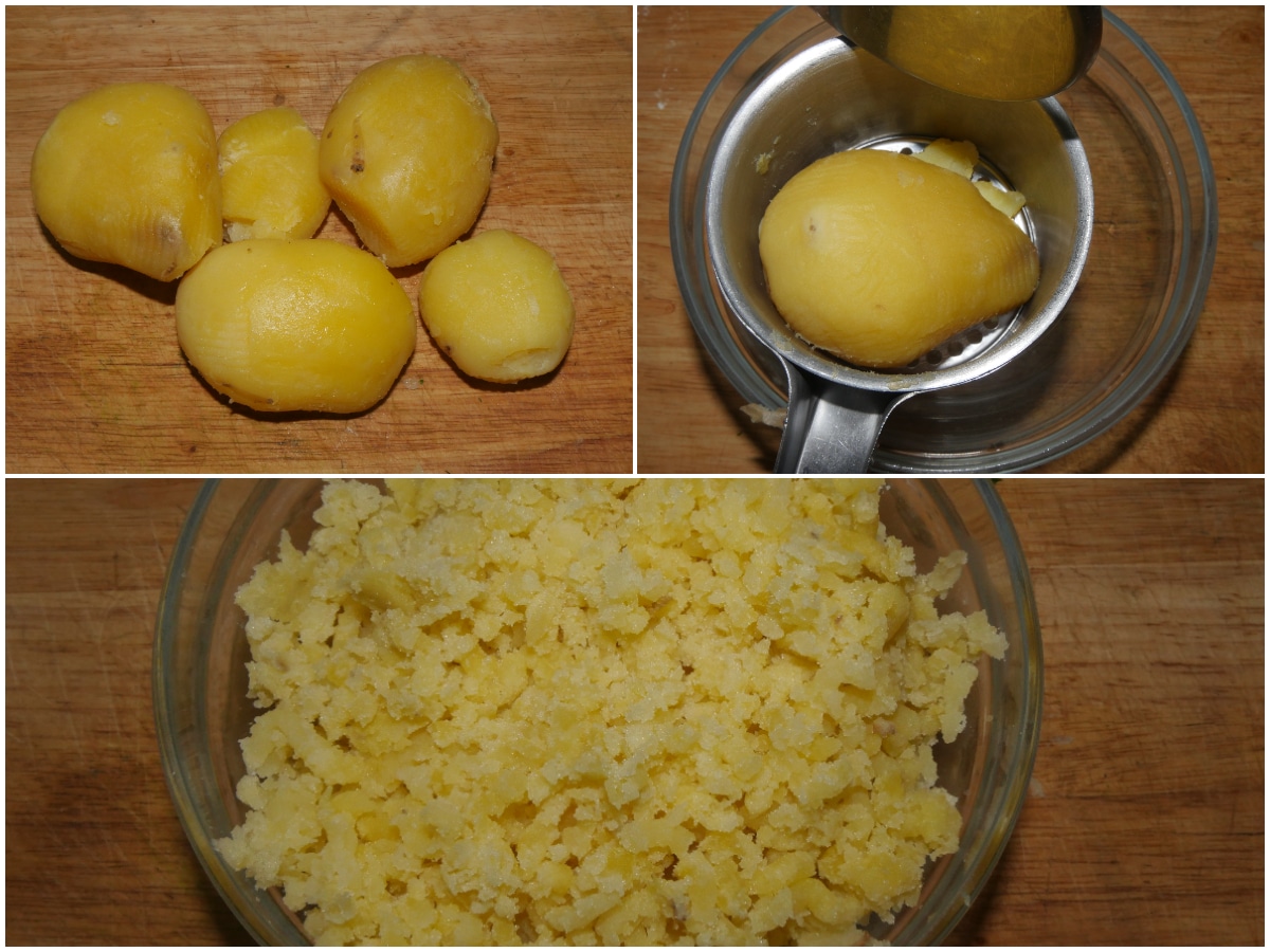 Quando le patate saranno cotte spellatele e passatele nello schiacciapatate.