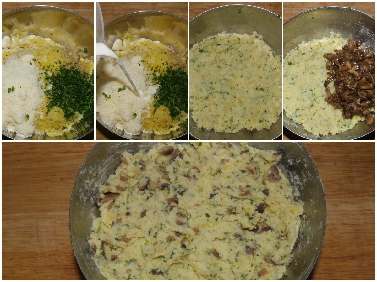 Unite alle patate anche grana, prezzemolo tritato, latte tiepido e mescolate, poi incorporate anche i funghi.