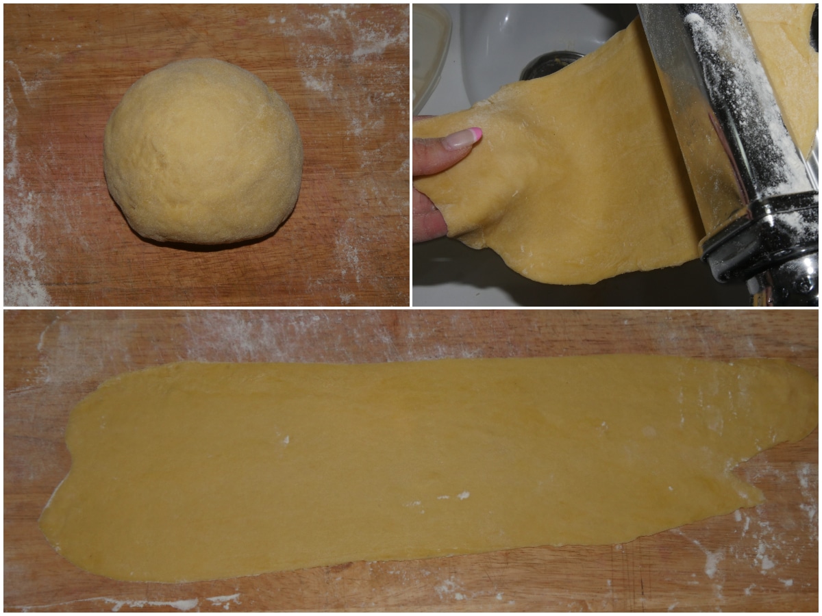 Riprendete la pasta, dividetela a pezzi e stendetela nella macchinetta tirasfoglia, partendo da uno spessore più grande e riducendolo fino ad ottenere una sfoglia mediamente sottile.