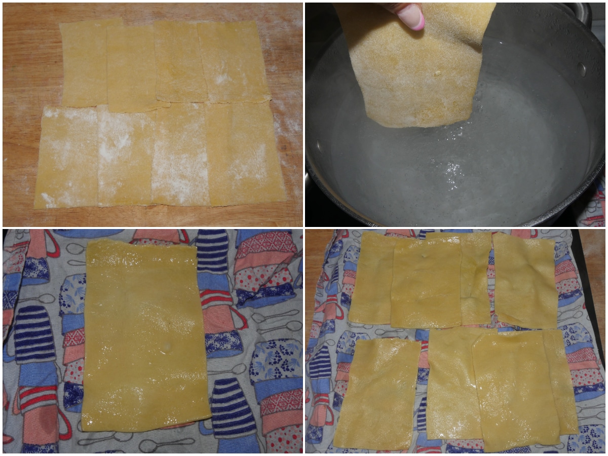 Tagliate la sfoglia per ricavare dei rettangoli da circa 10x15 cm e lessetene pochi per volta in acqua bollente leggermente salata, quindi scolateli e lasciateli su di un canovaccio pulito, cercando di non sovrapporli troppo tra di loro.