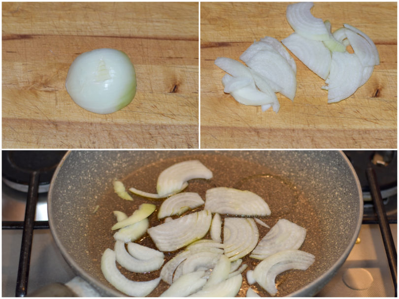 Innanzitutto mondate la cipolla e tagliatela a fettine sottili, quindi lasciatela appassire in un'ampia casseruola antiaderente con un po' di olio.