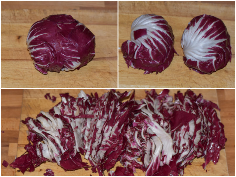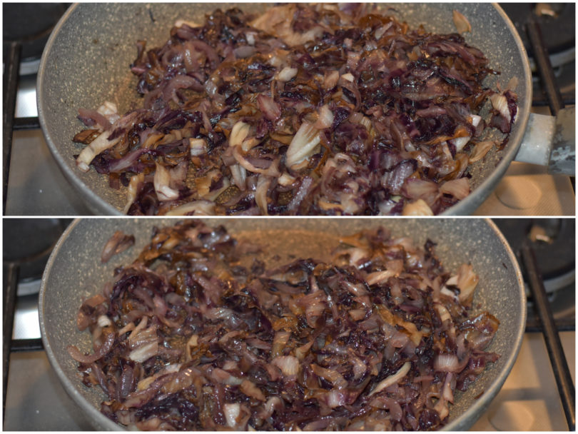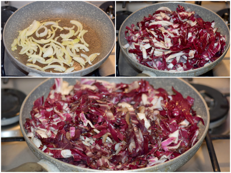 Fate lo stesso con il radicchio, tagliandolo a listarelle, e aggiungetelo alla cipolla: salate leggermente e lasciate cuocere per almeno 10 minuti o fin quando non si sarà ammorbidito.