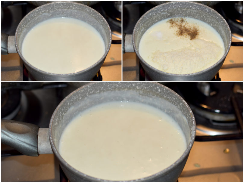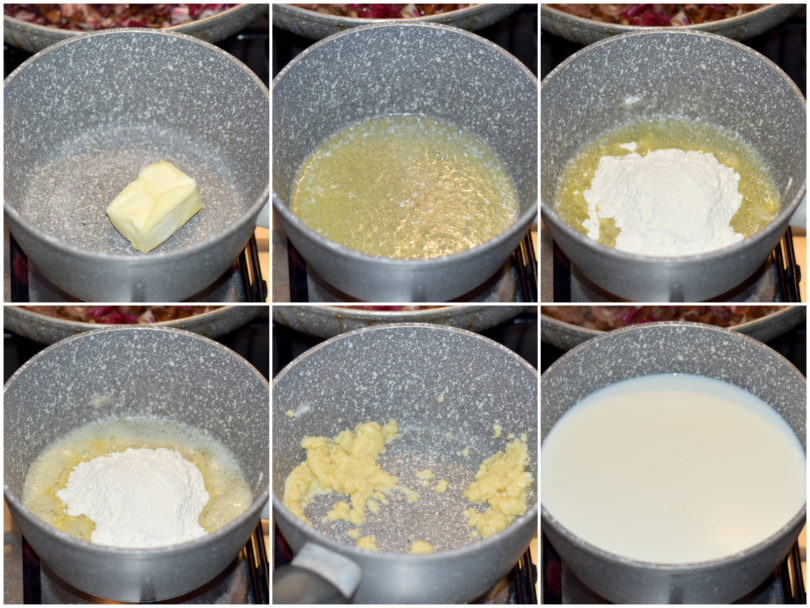 Nel frattempo che il radicchio cuoce, preparate la besciamella: sciogliete il burro in una casseruola dal fondo spesso, aggiungete la farina tutta insieme, mescolate bene, quindi incorporate il latte precedentemente riscaldato, continuando a mescolare con le fruste per non far creare grumi fin quando non avrete ottenuto una salsa liscia e omogenea, non troppo densa, quindi insaporite con parmigiano, sale e noce moscata e lasciate intiepidire.
