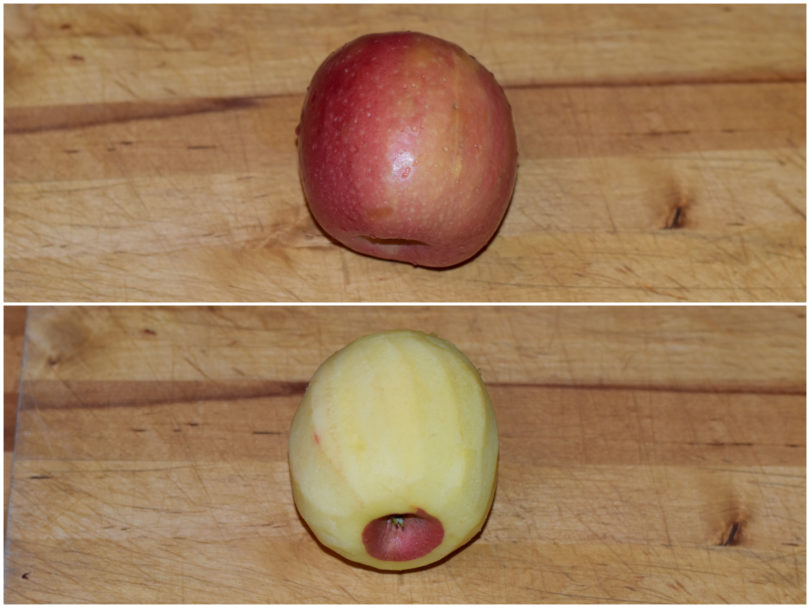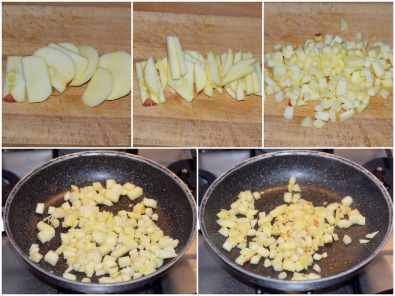 Mondate la mela e tagliatela a cubettini, quindi saltatele in padella con un filo d'acqua o una noce di burro fin quando non si saranno ammorbiditi (ci vorranno 5-6 minuti).
