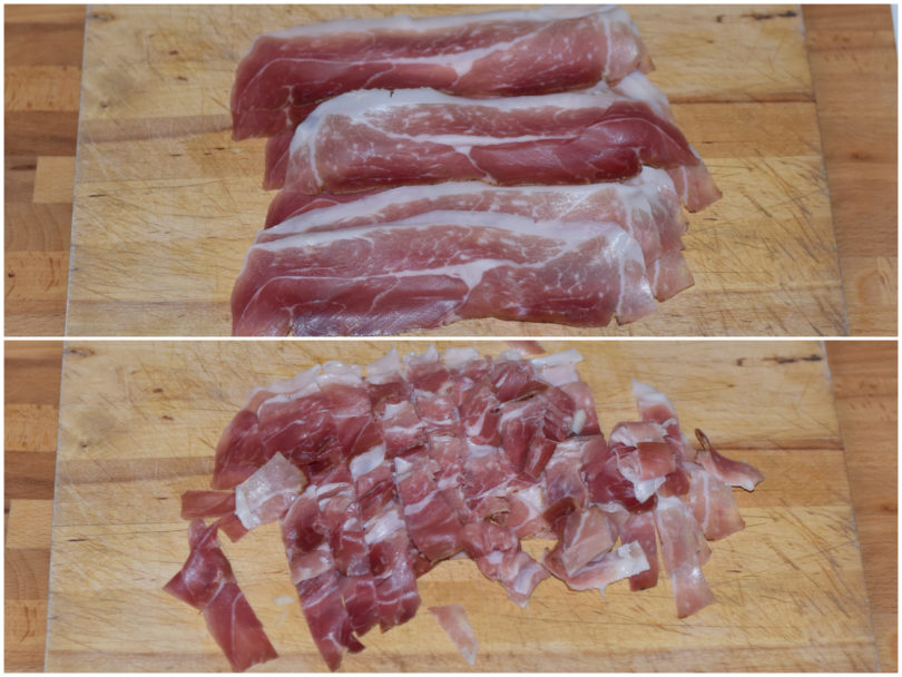 Tagliate lo speck a listarelle e lasciatelo tostare in una padella antiaderente fino a renderlo croccante.