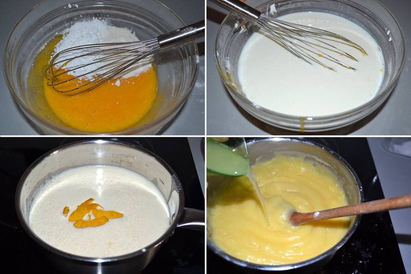Trasferite in un pentolino, aggiungete la buccia di limone e cuocete a fiamma dolce, mescolando costantemente per non far venire grumi, fino ad ottenere una crema piuttosto soda, quindi togliete dal fuoco, eliminate la buccia e incorporate il succo di limone.