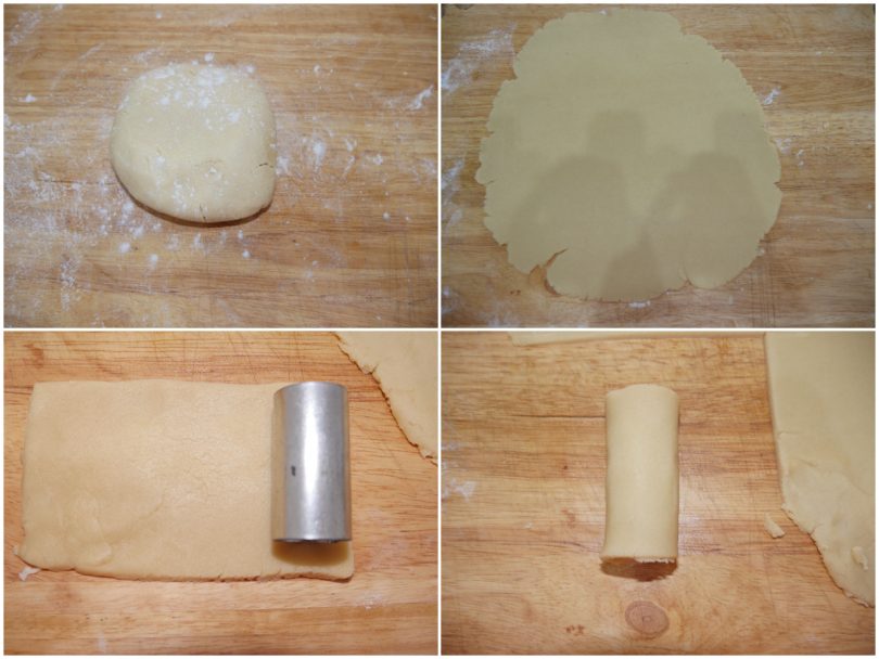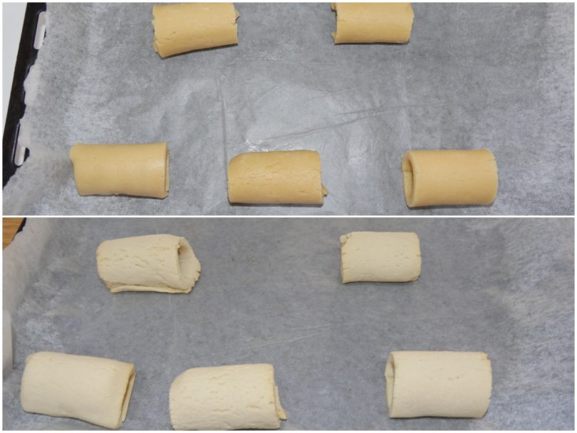 Avvolgete ogni rettangolo intorno al suo stampino e fateli riposare in frigo per almeno 15 minuti, poi disponeteli sulla teglia rivestita di carta forno e cuocete per 10-15 minuti (dovranno appena iniziare a dorarsi ai bordi, senza scurirsi troppo) a 170°C, in forno ventilato già caldo.
