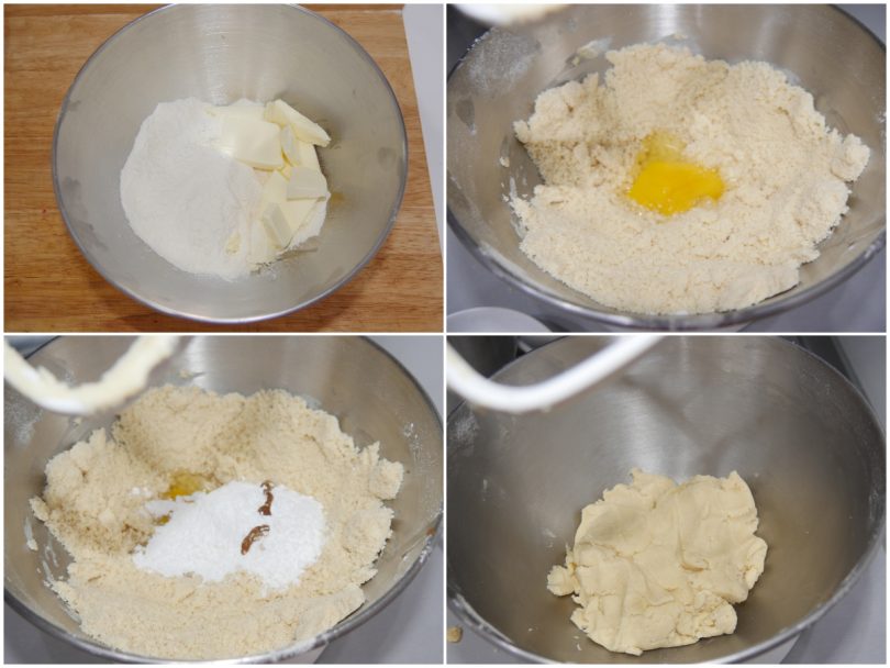 Innanzitutto preparate la pasta frolla: unite tutti gli ingredienti insieme in una ciotola e amalgamate velocemente, avvolgete il panetto con pellicola trasparente e lasciatelo riposare in frigo per almeno 1 ora.
