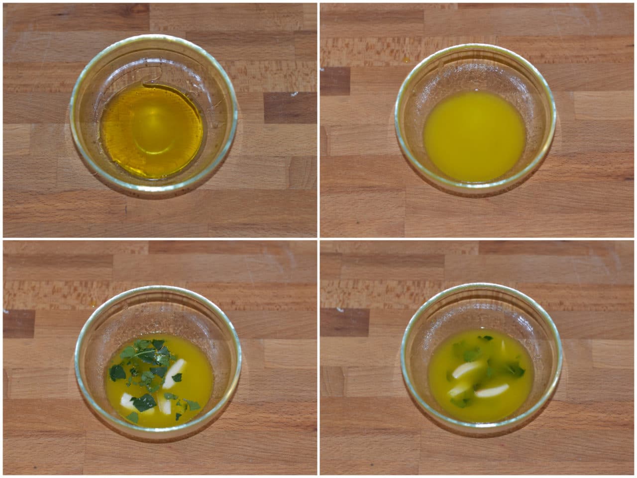 Versate in una ciotolina succo di limone, olio, aglio a fettine, alloro sminuzzato e sale, mescolando con un cucchiaino fino ad ottenere un'emulsione.