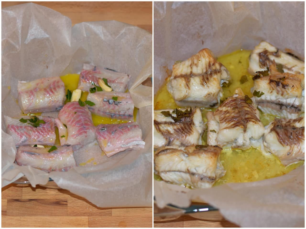 Disponete il pesce in una teglia rivestita di carta forno, irroratelo con l'emulsione e cuocete per circa 40 minuti in forno ventilato preriscaldato a 180°C.