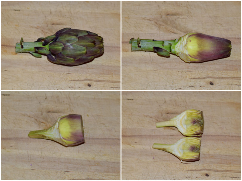 Innanzitutto mondate i carciofi (vi consiglio di indossare i guanti, in modo da non farvi annerire le mani) eliminando gambi, punte, foglie esterne e barbe (qui la guida completa per farlo al meglio).