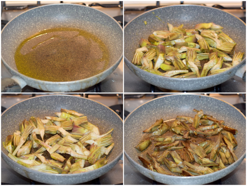 Fate scaldare un po' di olio in una padella antiaderente, aggiungete i carciofi ben scolati e cuocete a fiamma medio-bassa con coperchio per circa 15 minuti o fin quando non risulteranno teneri, quindi salate.