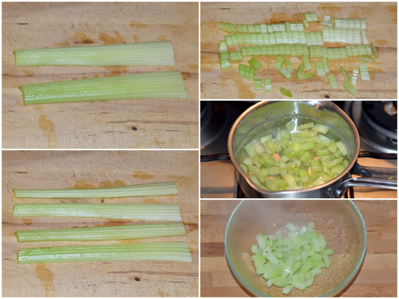 Nel frattempo mondate il sedano, tagliatelo a metà per il lungo e poi a fettine, quindi cuocetelo per 5 minuti in acqua già bollente e scolatelo.