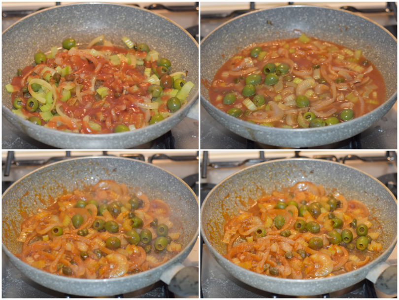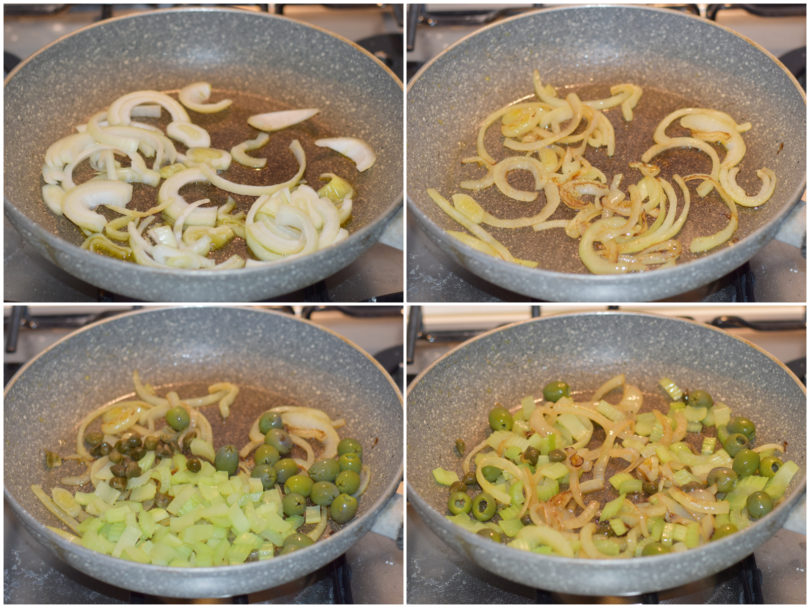 Fate appassire la cipolla a fiamma bassa in un'ampia padella antiaderente con poco olio, poi unite sedano, olive e capperi e lasciate insaporire.