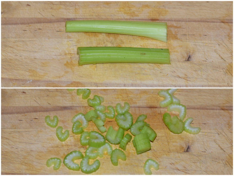Innanzitutto mondate le verdure, quindi tagliate la cipolla a fettine, il sedano a rondelle e le mele a cubetti.