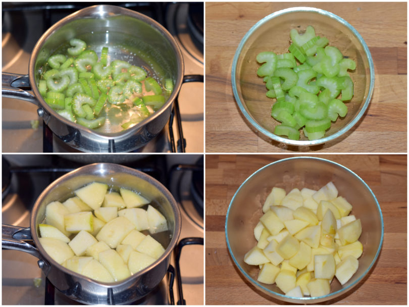 Portate a ebollizione dell'acqua leggermente salata in una casseruola: sbollentate il sedano per 5 minuti, poi scolatelo con una schiumarola e sbollentate le mele per altri 5 minuti, quindi scolate anche queste, tenendo l'acqua da parte.