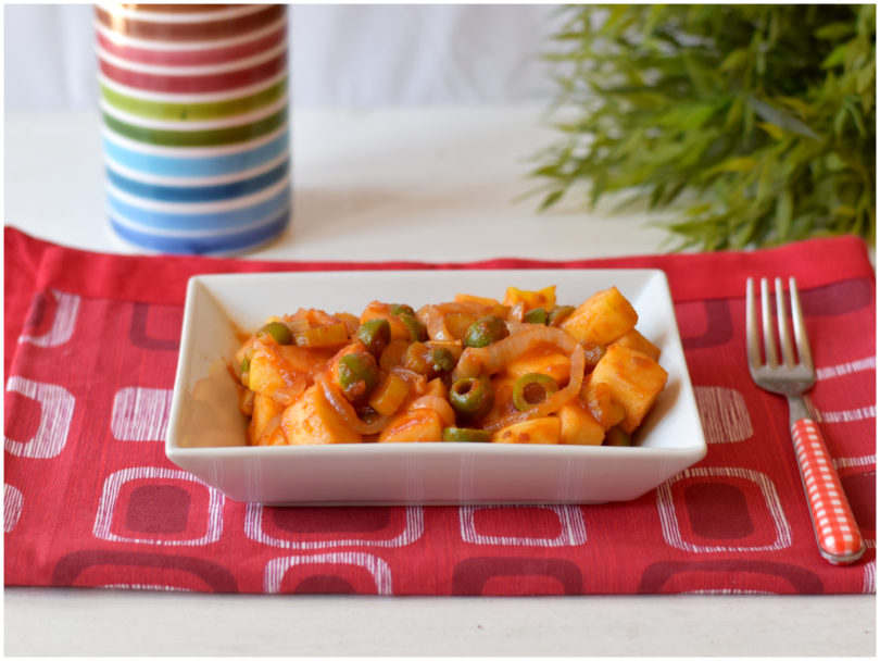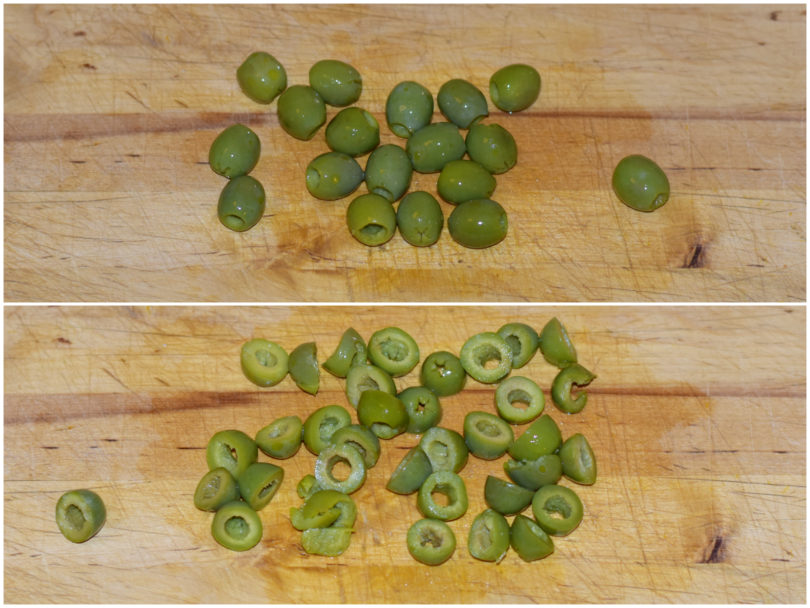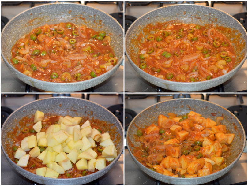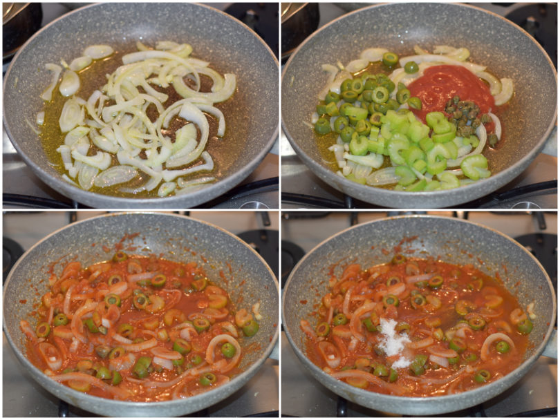 Unite alle cipolle: sedano, olive, capperi dissalati, passata, sale, pepe e 2 cucchiai di acqua di cottura.