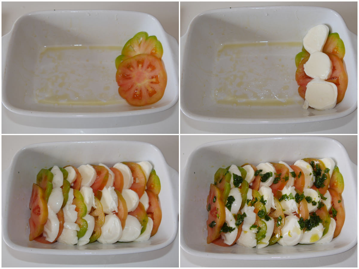 Prendete una pirofila adatta per la cottura in forno, ungete leggermente il fondo e iniziate a comporre la vostra caprese, alternando fettine di pomodoro e di mozzarella.