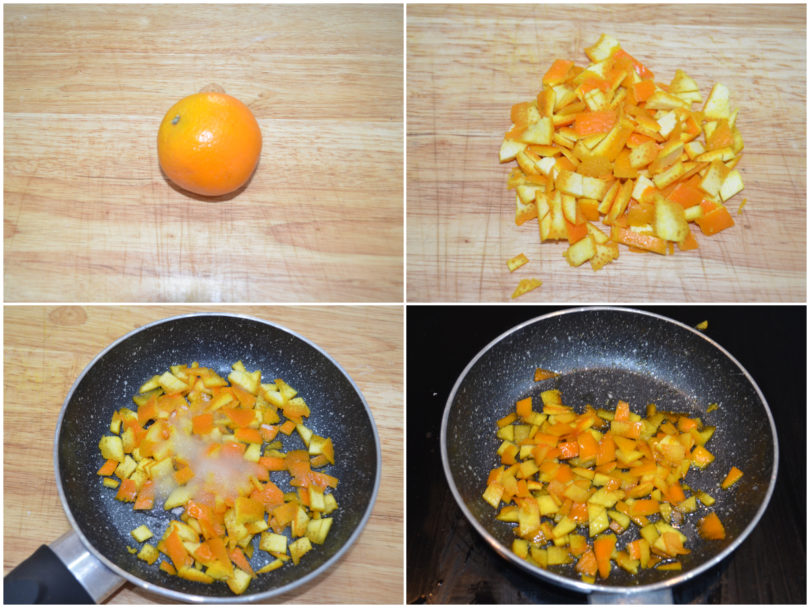 Innanzitutto preparate le scorzette di arancia: sbucciate 1 delle 2 arance lasciando anche un pochino della parte bianca (quella amara), tagliate la buccia a pezzetti, mettetela in una padella con lo zucchero semolato e l'acqua, portate a bollore e lasciate caramellizzare per un paio di minuti, mescolando.