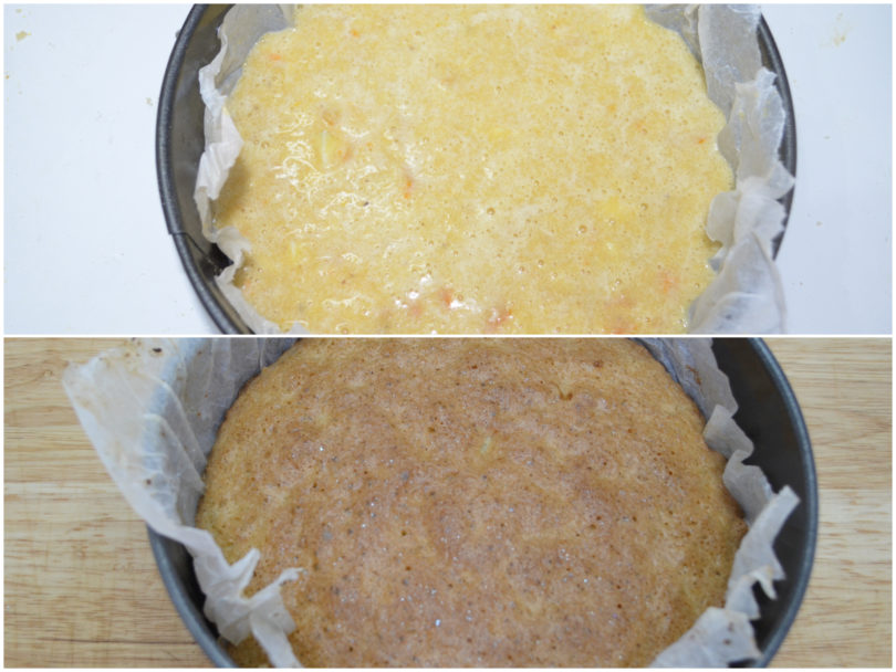 Versate l'impasto così ottenuto nello stampo rivestito di carta forno e infornate a 200°C in forno ventilato già caldo.