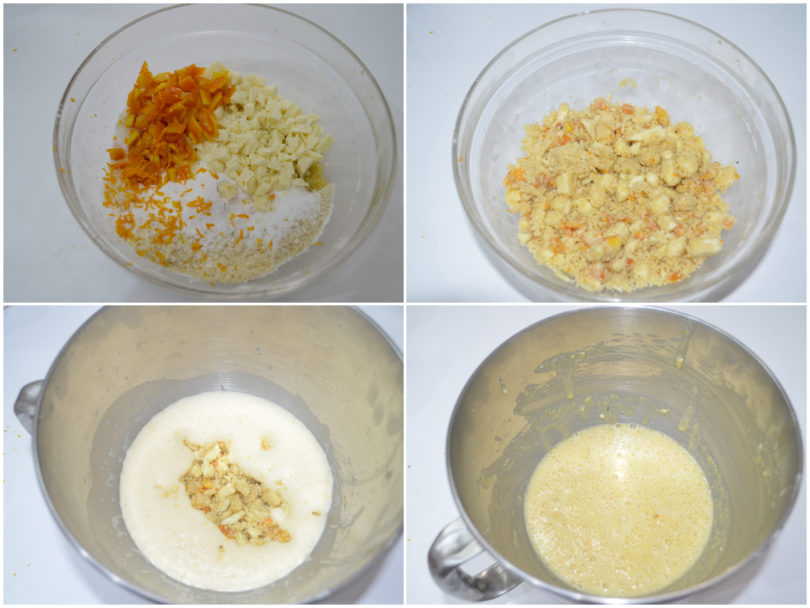 A parte mescolate insieme farina di mandorle, fecola, buccia grattugiata del limone e della seconda arancia, lievito setacciato, cioccolato bianco sminuzzato, i pezzetti di arancia candita e un pizzico di sale.