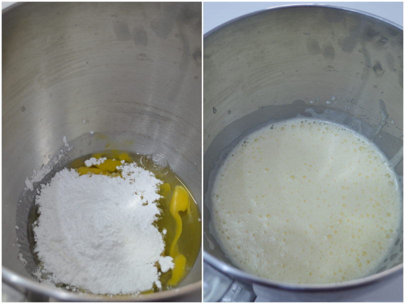 Montate le uova con lo zucchero a velo fino ad ottenere un composto gonfio, chiaro e spumoso.