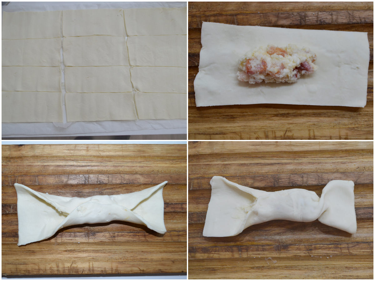 Ricavate dalla sfoglia 12 rettangolini, farcite il centro di ognuno con un paio di cucchiaini di ripieno e chiudete la sfoglia a caramella, sigillando i bordi intorno al ripieno.