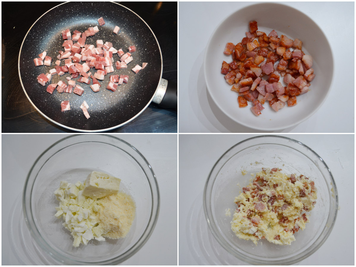A parte, lavorate i formaggi tra di loro: mozzarella a dadini, parmigiano grattugiato, gorgonzola a tocchetti.
