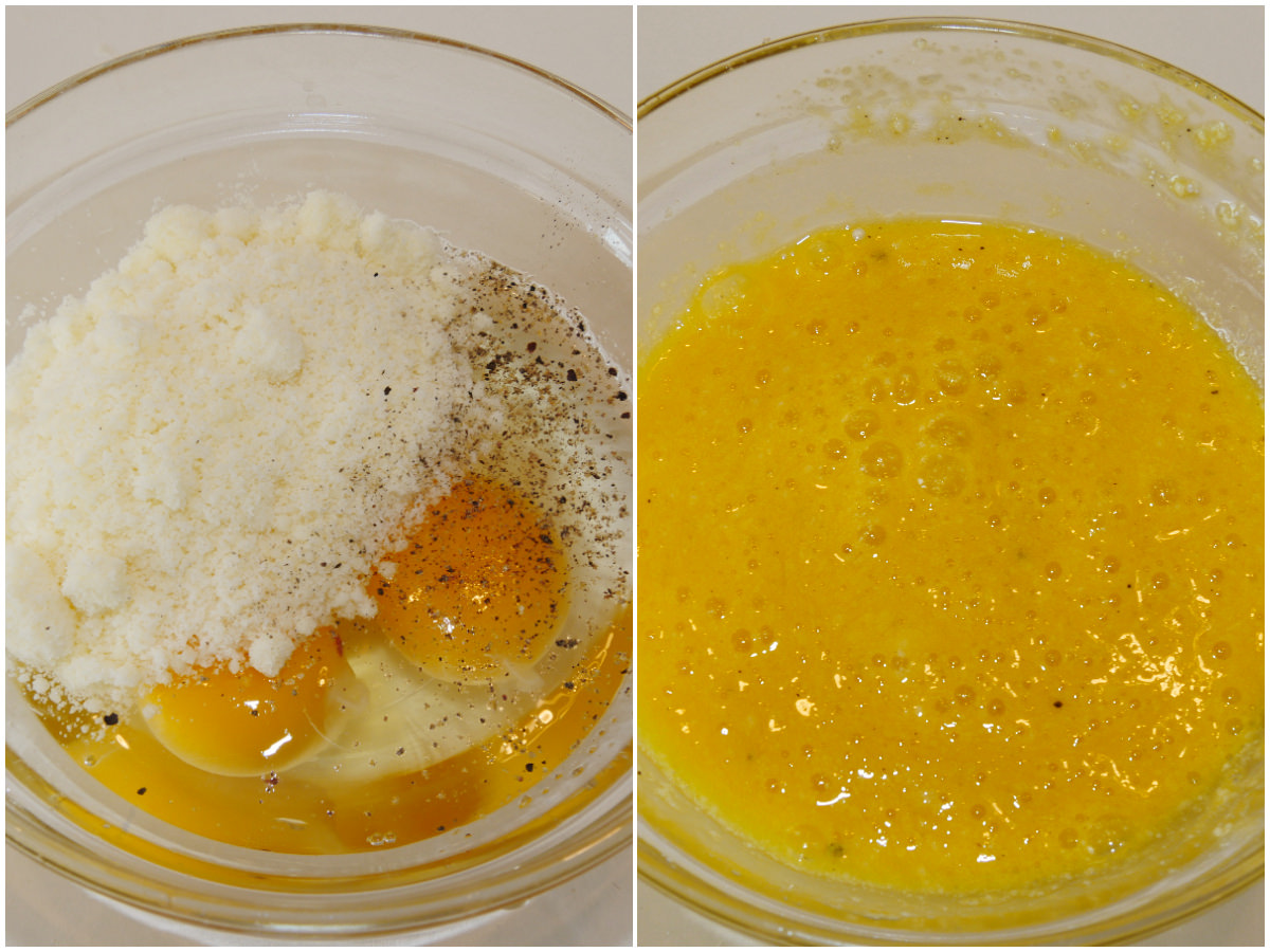 In una ciotola, sbattete le uova con sale, pepe e pecorino.
