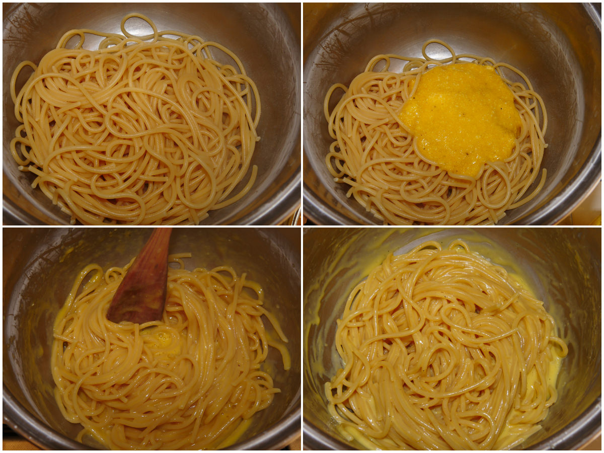 Scolate la pasta ben al dente (conservate un po' di acqua di cottura), rimettetela nella pentola, aggiungete le uova (e un po' di acqua di cottura, se serve) e mescolate bene in modo che le uova si cuociano parzialmente con il calore della pentola.