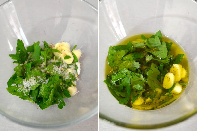 Nel frattempo preparate la marinata: unite in una ciotola aglio a fettine, prezzemolo spezzettato, sale, pepe, olio a piacere e aceto.