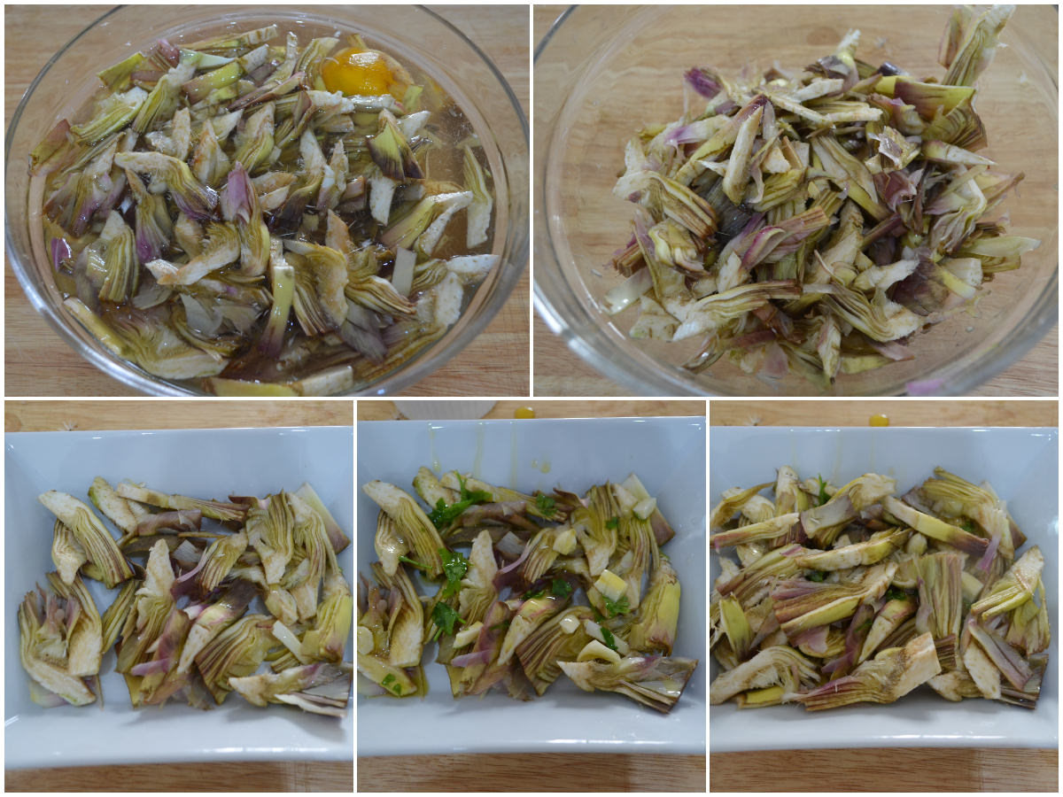 A questo punto scolate i carciofi, eliminate il limone e disponete i carciofi in un piatto, a strati, cospargendo ogni strato con la marinata prima di aggiungere quello successivo.