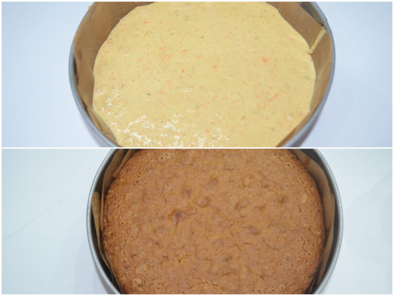 Versare il composto in una tortiera a cerniera imburrata e infarinata. Infornare la carrot cake a 180° e cuocere per 50 minuti.